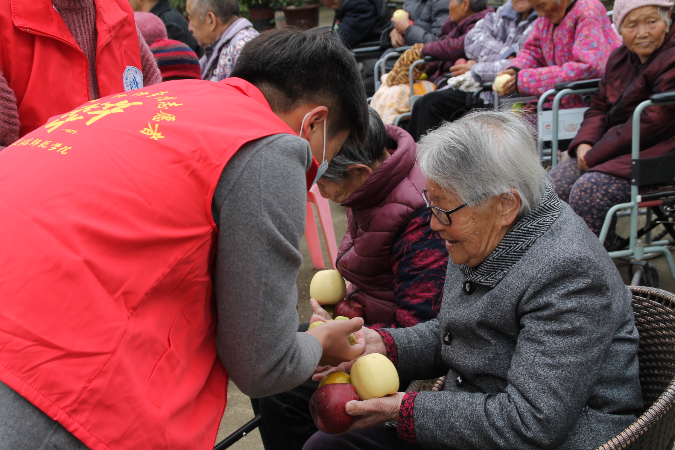 在谢艳丽、张艺成老师的带领下,志愿者们分为若干小组,有的进入各楼层房间,给老人送去盆栽绿植和新鲜水果;有的在院子里陪老人“拉家常”,给他们带来欢笑;有的帮老人打扫房间,给他们提供更好的环境;有的发放防诈宣传页,为老人指导使用手机。最后,志愿者们与老人们一一告别,并祝愿他们保重身体,安享晚年。