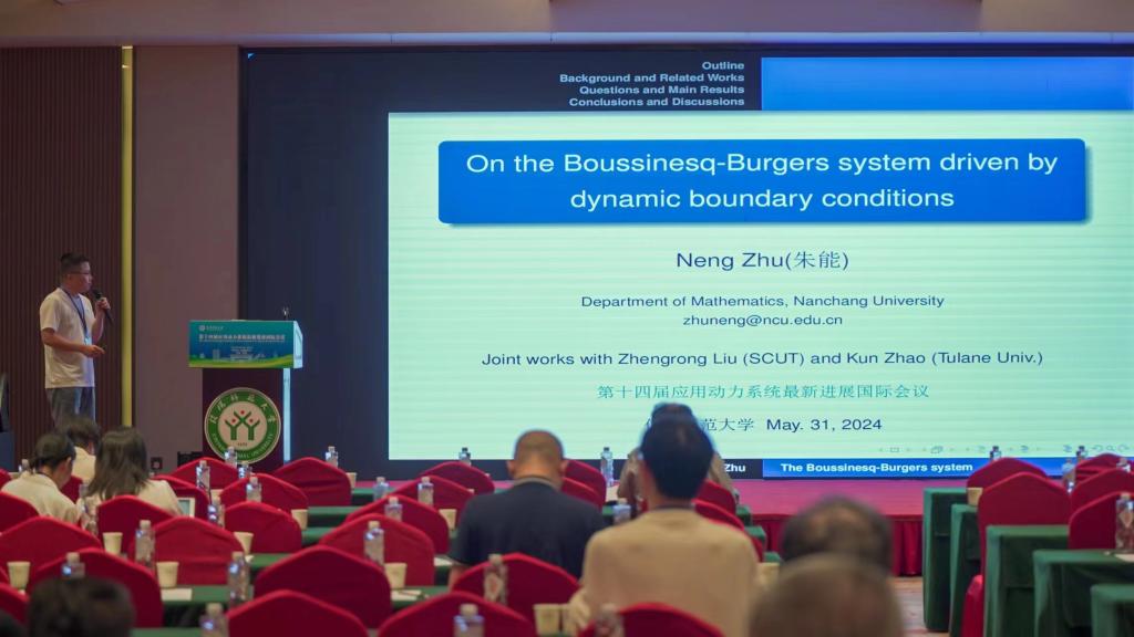 南昌大学的朱能,做了题目为《On the Boussinesq-Burgers system driven by dynamic boundary conditions》的报告。