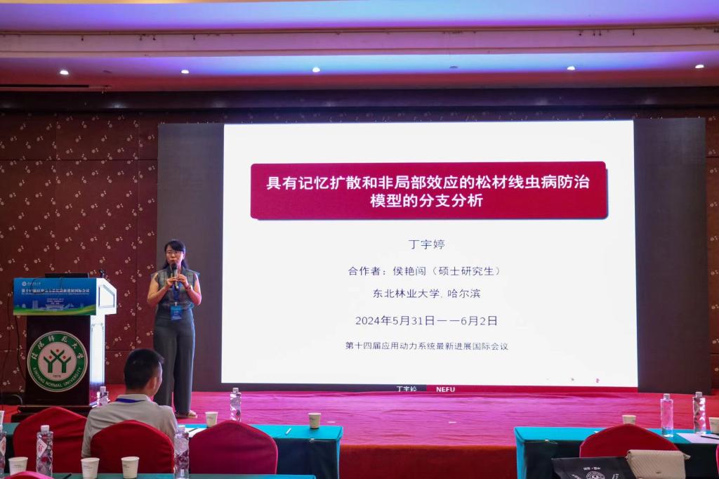东北林业大学的丁宇婷,做了题目为《具有记忆扩散和非局部效应的松材线虫病模型的分支分析》的报告。