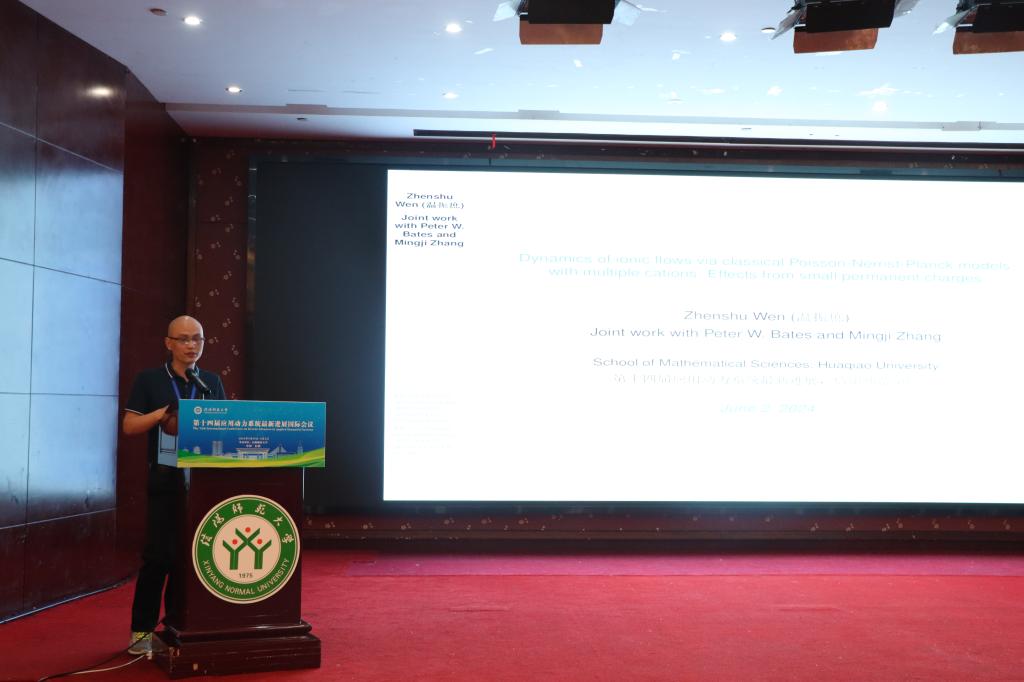 华侨大学的温振庶,做了题目为《Dynamics of ionic flows via classical Poisson-Nernst-Planck models with multiple cations:Effects from small permanent charges》的报告。