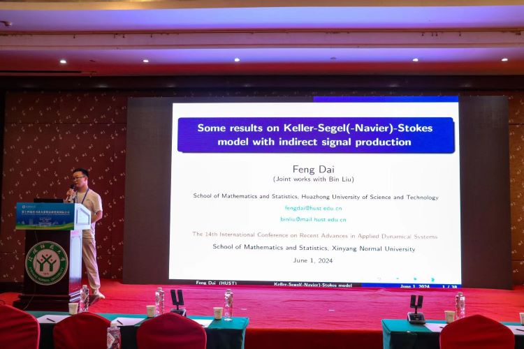 华中科技大学的戴峰做了题目为《Some results on Keller-Segel- Navier-Stokes model with indirect signal production》的报告。