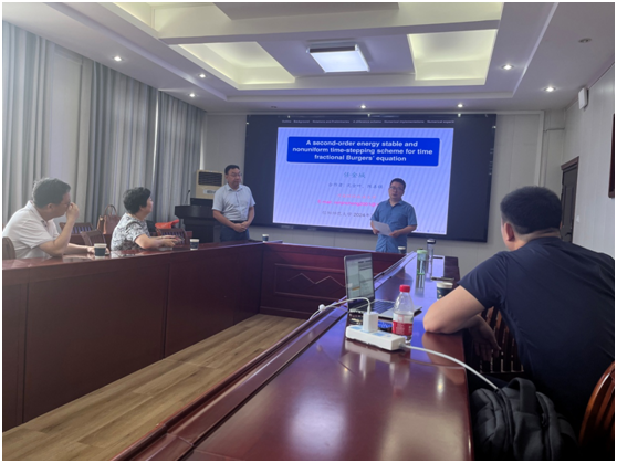 7月28日上午,应pa视讯集团官网邀请,河南财经政法大学任金城教授作了题为《A second-order energy stable and nonuniform time-stepping scheme for time fractional Burgers' equation》的学术报告。报告会由李世顺教授主持,部分老师及研究生聆听了此次报告。