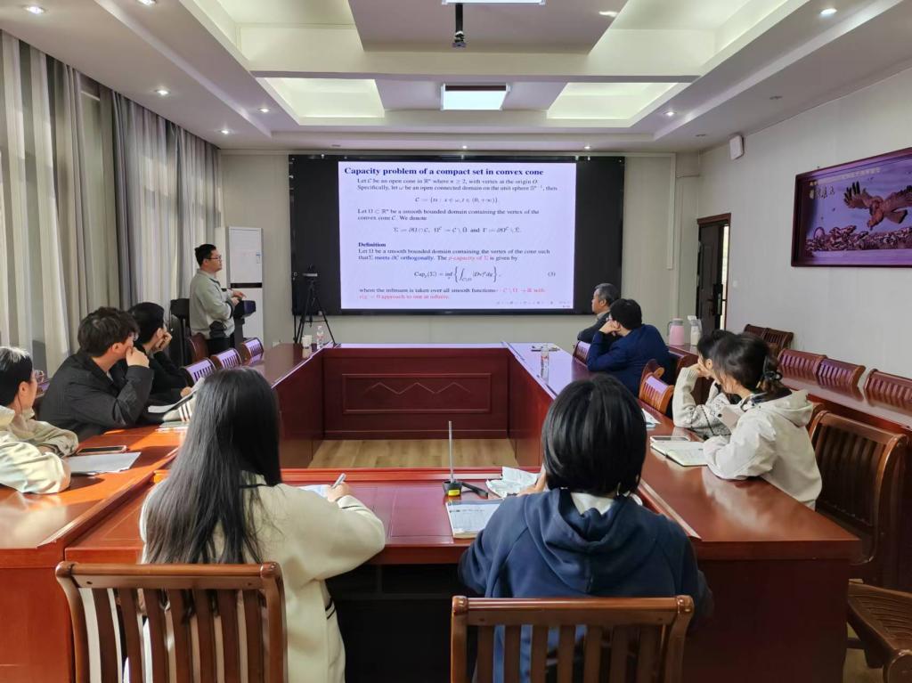 10月25日上午,应pa视讯集团官网邀请,广西师范大学尹佳斌副教授作了题为《Sharp upper bounds of $p$-capacity in convex cone and asymptotically flat half-space》的学术报告。报告会由副经理韩英波教授主持,部分教师及研究生聆听了此次报告。