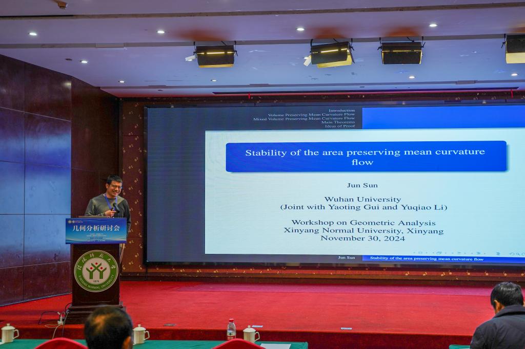 第4场学术报告是由武汉大学的孙俊教授作了题目为“Translating solitons to a Lagrangian mean curvature flow with zero Maslov class”的学术报告,此场学术报告由河南师范大学的许瑞伟教授主持。