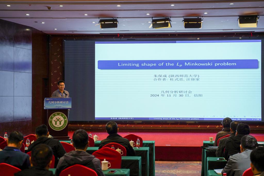 第2场学术报告是由陕西师范大学的朱保成教授作了题目为“Limiting shape of the Lp Minkowski problem”的学术报告,此场学术报告由河南师范大学的黄广月教授主持。