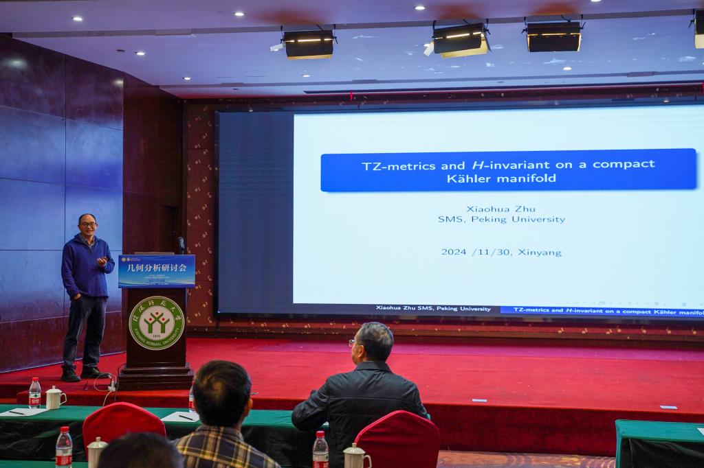 11月30日上午共有4场学术报告,第1场学术报告是由北京大学的朱小华教授作了题目为“TZ metric and H-invariant on a compact Kahler manifold”的学术报告,此场学术报告由重庆师范大学的程新跃教授主持。