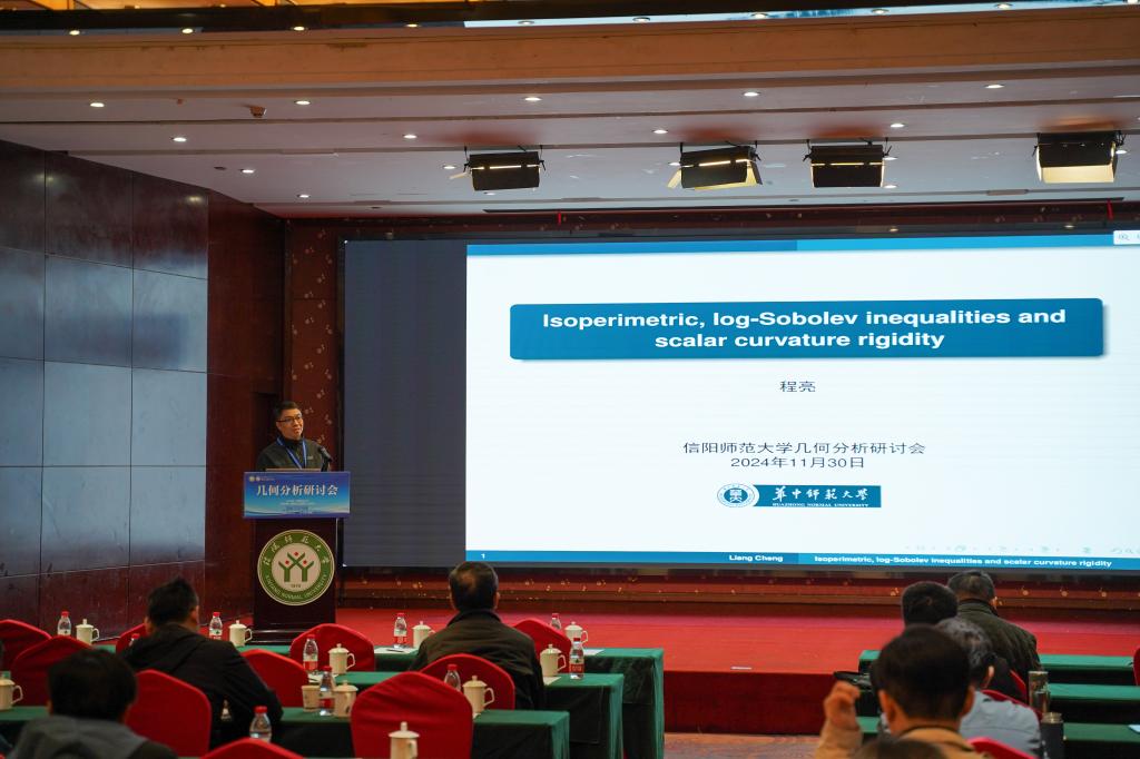 第2场学术报告是由华中师范大学的程亮教授作了题目为“Isoperimetric, logarithmic Sobolev inequalities and scalar curvature rigidity”的学术报告,此场学术报告由重庆理工大学的罗勇教授主持。