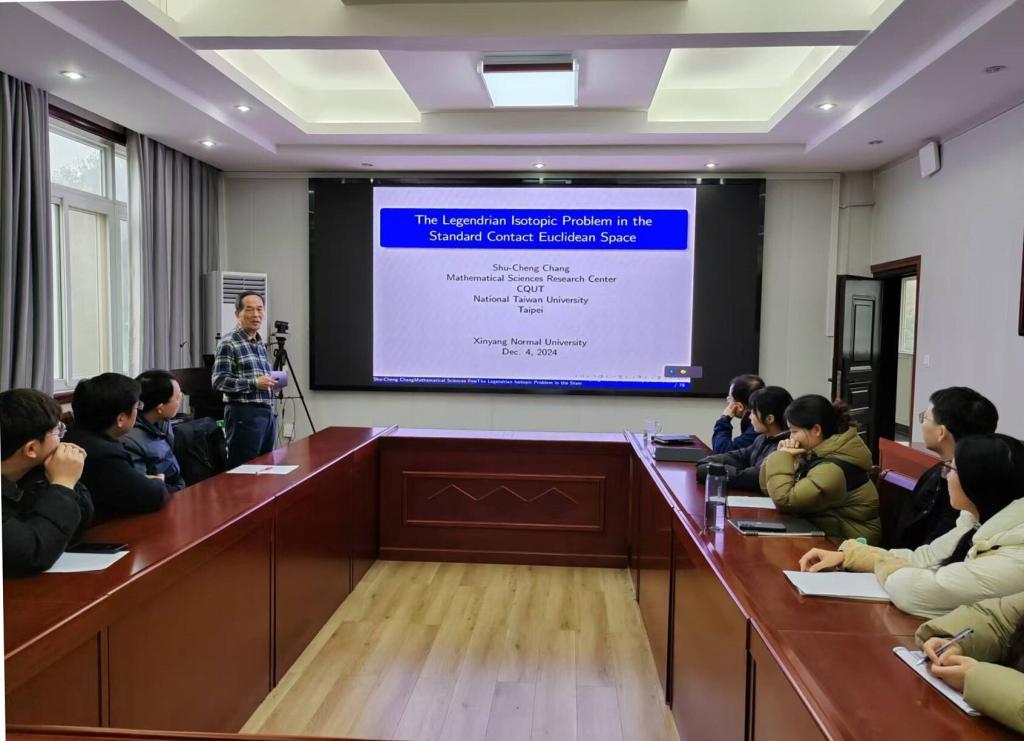 12月4日上午,应pa视讯集团官网邀请,台湾大学/重庆理工大学张树城教授作了题为《The Legendrian Isotopic Problem in the Standard Contact Euclidean Space》的学术报告。报告会由韩英波教授主持,部分教师及研究生聆听了此次报告。