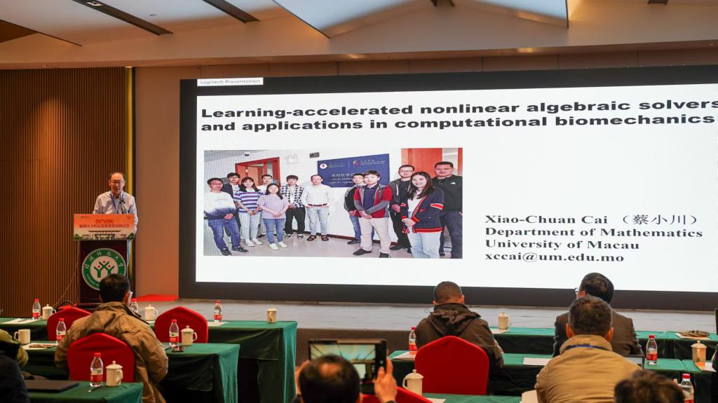 第1场报告由澳门大学蔡小川教授作了题目为《Learning-accelerated nonlinear algebraic solvers and applications in computational biomechanic》的学术报告。