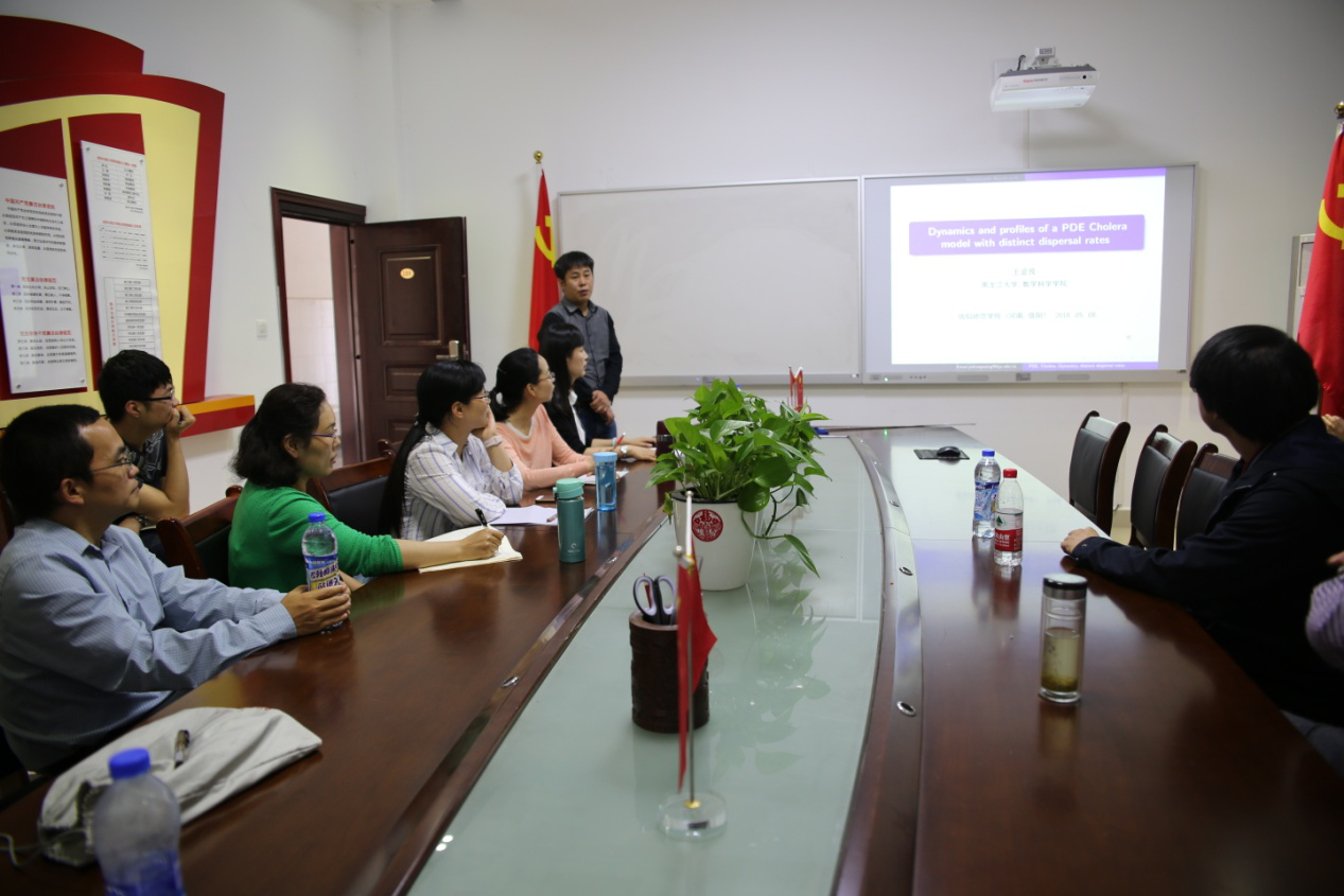 2018年5月8日下午,应pa视讯集团官网邀请,黑龙江大学王金良教授在数学公司党员之家作了题为“Dynamics and profiles of a PDE Cholera model with distinct dispersal rates”的学术报告。报告会由数学与统计公司党委书记王娟副教授主持,公司部分教师、研究生聆听了此次报告。