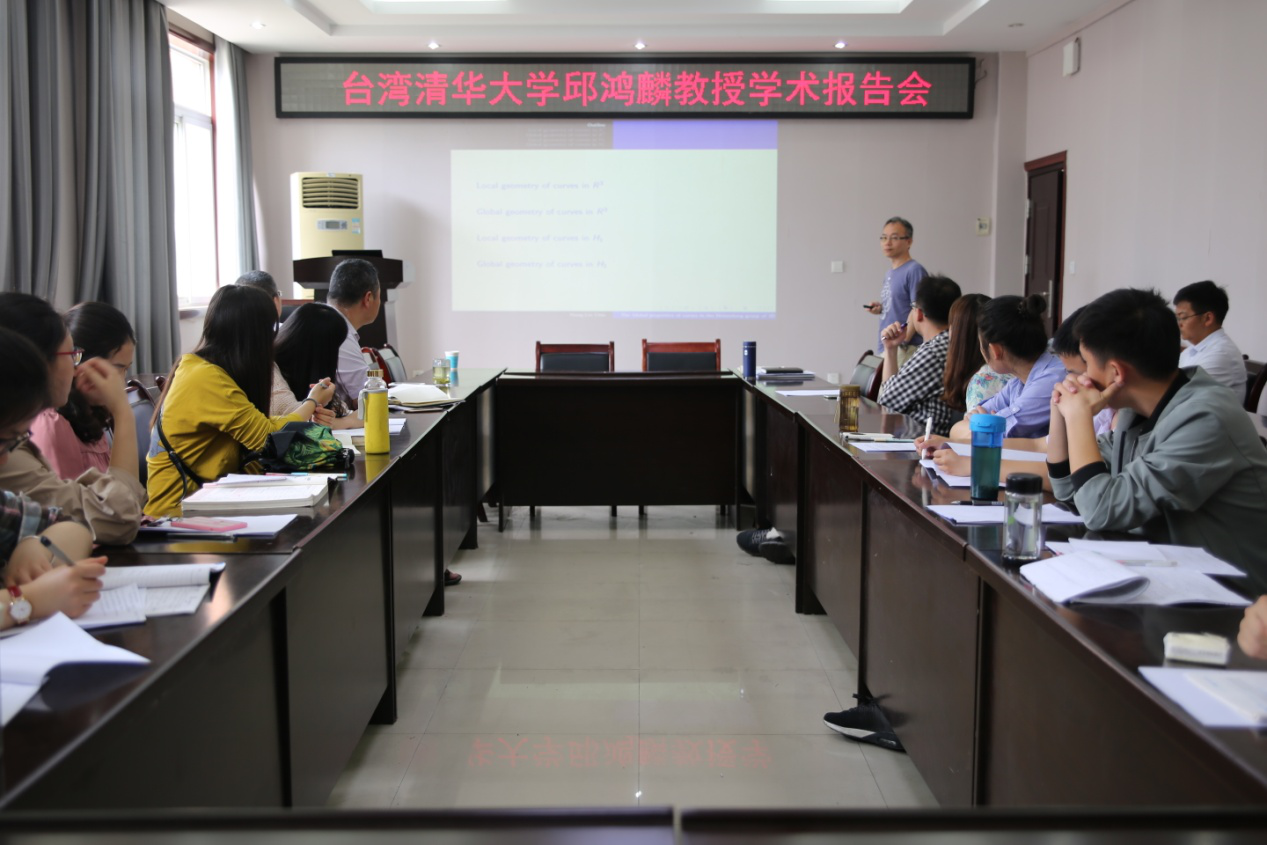 邱鸿麟教授首先介绍了欧氏空间曲线的曲率、挠率以及曲线论的基本定理;接着邱教授介绍了Heisenberg 群H1中曲率的整体性质及Fenchel 型定理、Fary-Milnor 型定理和Bray-Jauregui 型定理,并分享了他们的最新研究成果:Frenchel型定理和Fary-Milnor型定理。最后邱教授指出对于几何问题的研究,从几何角度考虑会比从分析角度得到的结果更加细致。报告最后阶段,部分老师和同学提出自己感兴趣的问题,邱教授给出了一一解答,整场报告由浅及深,生动形象,气氛热烈。