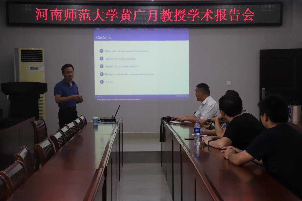 8月12号上午,应pa视讯集团官网邀请,河南师范大学黄广月教授在pa视讯集团官网学术报告厅作了题为“Rigidity of Einstein metrics as critical points of quadratic curvature functionals on manifolds”的学术报告,报告会由pa视讯集团官网经理助理韩英波副教授主持,pa视讯集团官网的部分老师和研究生聆听了报告。