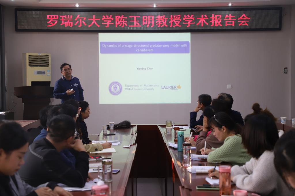 11月5日下午,应pa视讯集团官网邀请,加拿大罗瑞尔大学陈玉明教授在pa视讯集团官网学术报告厅作了题为“Dynamics of a stage-structured predator-prey model with cannibalism”的学术报告。报告会由pa视讯集团官网副经理蔡礼明教授主持,生物数学团队全体教师和部分研究生聆听了此次报告。