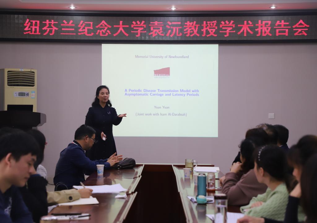 11月5日下午,应pa视讯集团官网邀请,加拿大纽芬兰纪念大学袁沅教授在pa视讯集团官网学术报告厅作了题为“A periodic disease transmission model with asymptomatic carriage and latency periods”的学术报告。报告会由pa视讯集团官网副经理蔡礼明教授主持,生物数学团队全体教师和部分研究生聆听了此次报告。