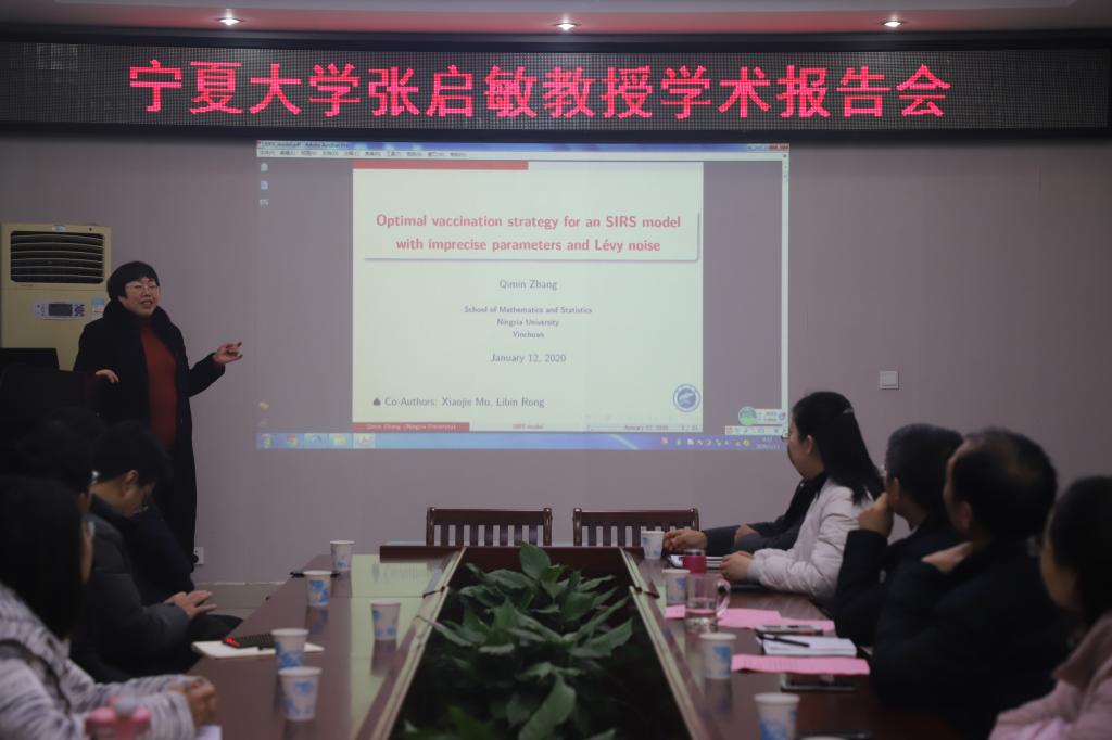 1月13日上午,应pa视讯集团官网邀请,宁夏大学张启敏教授在公司学术报告厅作了题为“Near-optimal control for a stochastic SIRS model with imprecise parameters”的学术报告,报告会由pa视讯集团官网副经理蔡礼明教授主持,数学与统计公司党委书记王娟教授,数学研究所所长宋新宇教授,公司部分老师和研究生聆听了此次报告。