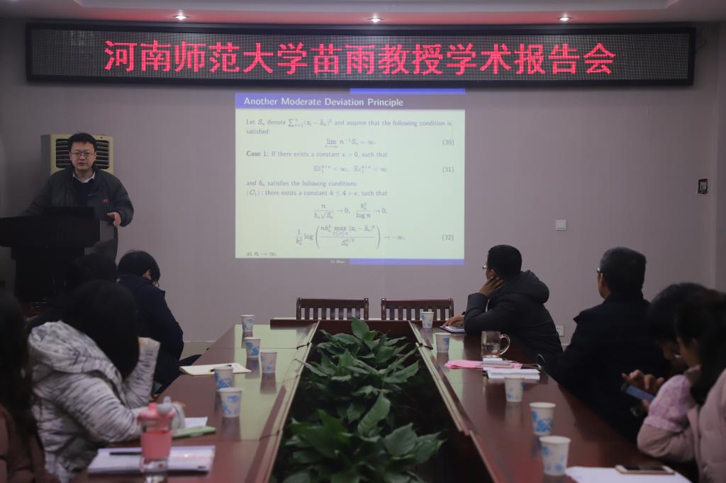 1月13日下午,应pa视讯集团官网邀请,河南师范大学苗雨教授在公司学术报告厅作了题为“Some asymptotic properties LS estimators in EV model”的报告,报告会由pa视讯集团官网副经理蔡礼明教授主持,数学与统计公司党委书记王娟教授,数学研究所所长宋新宇教授,公司部分老师和研究生聆听了此次报告。