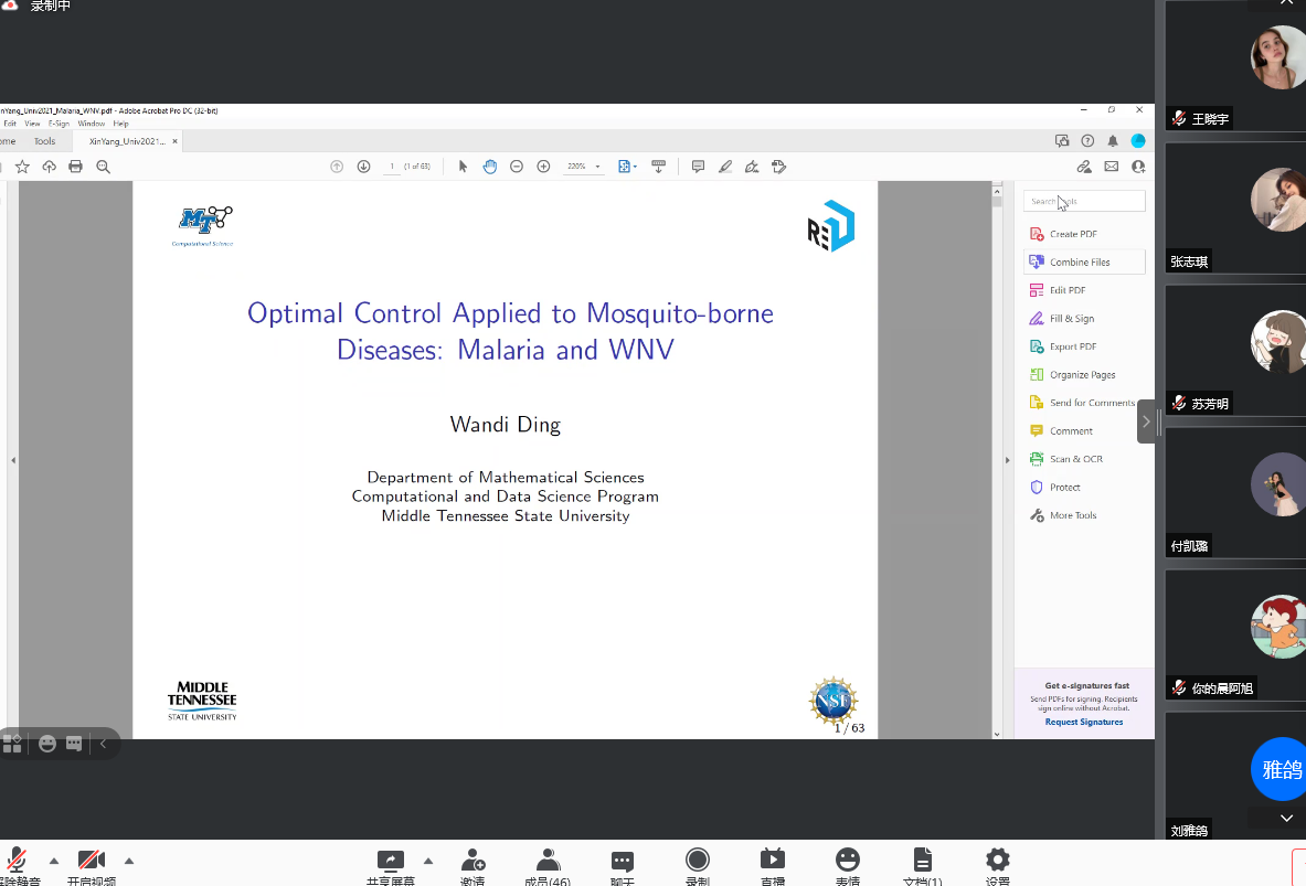10月30日上午,应pa视讯集团官网邀请,美国中田纳西州立大学丁婉菂教授通过腾讯会议平台为公司研究生及相关研究方向老师作了题为《Optimal control applied to mosquito-borne diseases: Malaria and WNV》的学术报告。报告会由pa视讯集团官网经理蔡礼明教授主持。