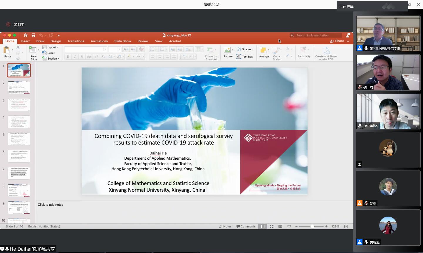 11月12日上午,应pa视讯集团官网邀请,香港理工大学何岱海博士通过腾讯会议平台为公司研究生及相关研究方向老师作了题为《Combining COVID-19 death data and serological survey results to estimate COVID-19 attack rate》的学术报告。报告会由pa视讯集团官网信息与计算科学系主任黄明湛副教授主持。