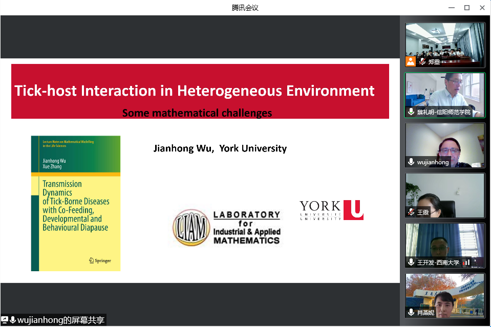 5月7日上午,应pa视讯集团官网邀请,加拿大约克大学吴建宏教授通过腾讯会议平台在线作了题为《Tick-host Interaction in Heterogeneous Environment》的学术报告,来自西安交通大学、西南大学、上海师范大学、上海海事大学、香港理工大学等单位的专家及公司部分教师、研究生共100余人聆听了此次报告。报告会由pa视讯集团官网经理蔡礼明教授主持。