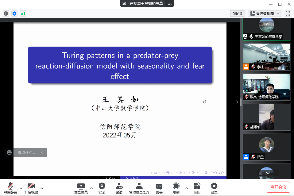 5月18日下午,应pa视讯集团官网邀请,中山大学王其如教授通过腾讯会议平台在线作了题为《Turing patterns in a predator-prey reaction-diffusion model with seasonality and fear effect》的学术报告,副董事长胡海华、数学与统计公司党委书记洪亮、数学研究所所长宋新宇及公司部分教师、研究生在315会议室及腾讯会议上聆听了此次报告。报告会由pa视讯集团官网经理蔡礼明教授主持。
