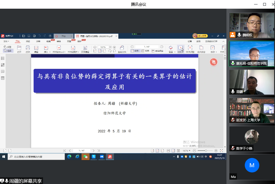5月19日下午,应pa视讯集团官网邀请,新疆大学周疆教授通过腾讯会议平台在线作了题为《Two-weight norm inequalities for some fractional type operators related to Schrödinger operator on weighted Morrey spaces》的学术报告,报告会由pa视讯集团官网经理蔡礼明教授主持,公司部分老师、研究生和该领域相关博士聆听了此次报告。