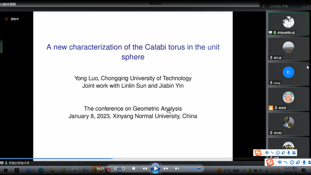 第2场报告由重庆理工大学罗勇教授报告,题目为《A new characterization of the Calabi torus in the unit sphere》。在报告中,罗勇教授讨论了单位球面中闭的极小Legendrian子流形的拼挤结果。得到了单位球中的Calabi环面的一个新的刻画。