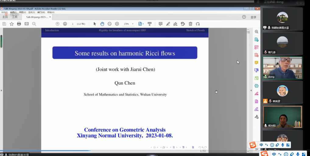 第1场报告由武汉大学陈群教授报告,题目为《Some results on harmonic Ricci flows》。在报告中,陈群教授讨论了在不同几何条件下调和Ricci流的周期解的刚性结果。