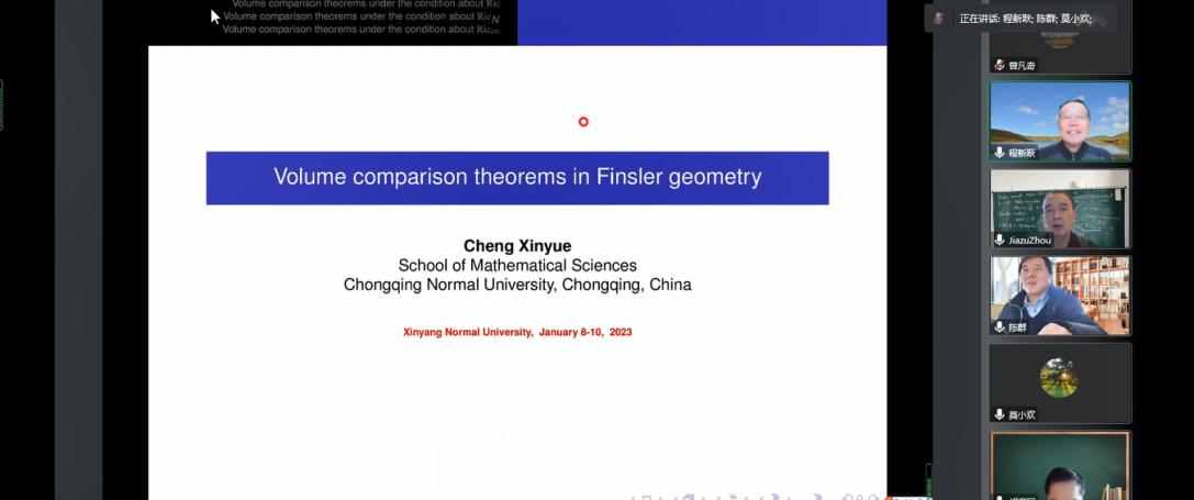第1场报告由重庆师范大学程新跃教授报告,题目为《Volume comparison theorems in Finsler geometry》。在报告中,程新跃教授讲述了Finsler 几何中的体积比较定理以及它们的重要应用。