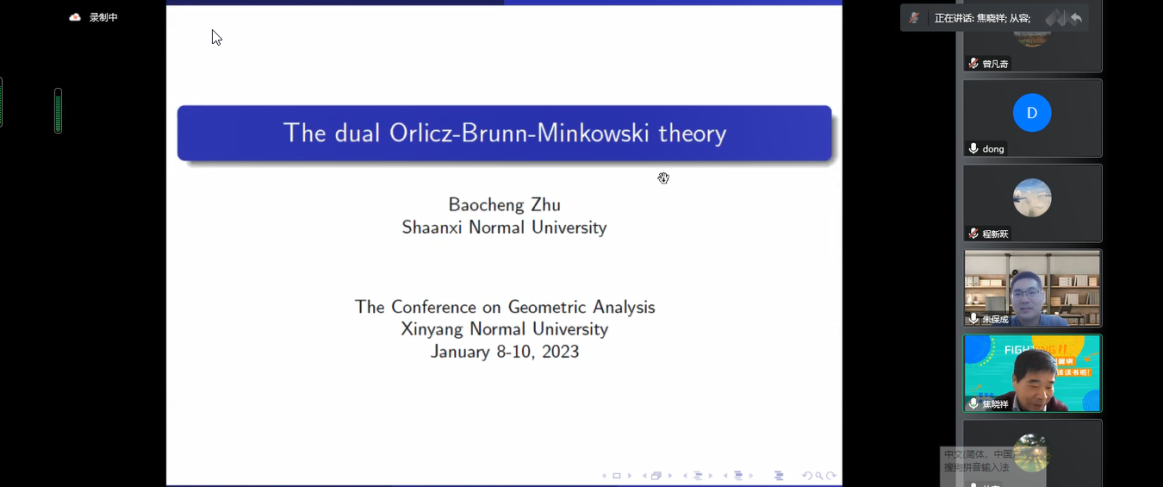 第3场报告由陕西师范大学朱保成教授报告,题目为《The dual Orlicz-Brunn-Minkowski theory》。在报告中,朱保成教授讨论了他最近引进的对偶Orlicz-Brunn-Minkowski 理论和与之相关的对偶Orlicz-Minkowski 问题。