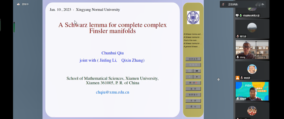 第2场报告由厦门大学邱春晖教授报告,题目为《A Schwarz lemma for complete complex Finsler manifolds》。在报告中,邱春晖教授讨论了完备的复 Finsler流形上的一个广义Schwarz 引理及其证明。