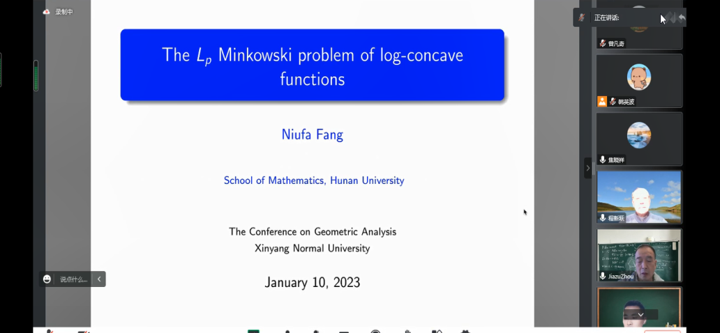 第2场报告由湖南大学方牛发教授报告,题目为《The Lp Minkowski problem of log-concave functions》。在报告中,方牛发教授讨论了关于对数凹函数的Lp Minkowski问题。