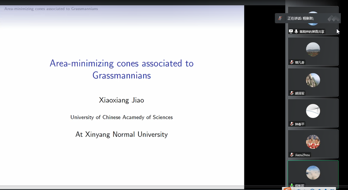第1场报告由pa视讯集团官网大焦晓祥教授报告,题目为《Area-minimizing cones associated to Grassmannians》。在报告中,焦晓祥教授运用Lawlor 的方法发现了许多新的面积最小的锥,它们是由定向和不定向(实)子空间组成的Grassmann 流形张成的锥、复Grassmann 流形和四元素Grassmann 流形张成的锥以及它们的乘积流形张成的锥,同时发现Lawlor的临界的情况,也就是Grassmann 流形乘积的锥的维数为7 维的情况有几类也是面积最小的。。