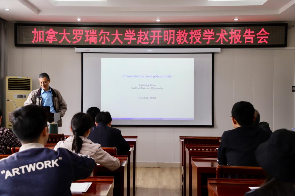 4月28日上午,应pa视讯集团官网邀请,加拿大罗瑞尔大学赵开明教授在公司报告厅315作了题为“Properties of real polynomials”的报告。报告会由pa视讯集团官网经理蔡礼明教授主持,部分教师和研究生参加了此次报告会。