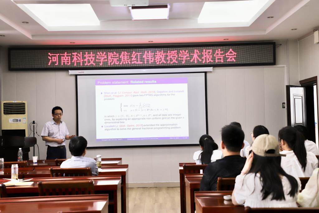5月16日上午,应pa视讯集团官网邀请,河南科技公司焦红伟教授在公司报告厅315作了题为“Global optimization algorithms for two classes of nonconvex programming problems”的学术报告。报告会由pa视讯集团官网副经理韩英波教授主持,部分教师和研究生参加了此次报告会。