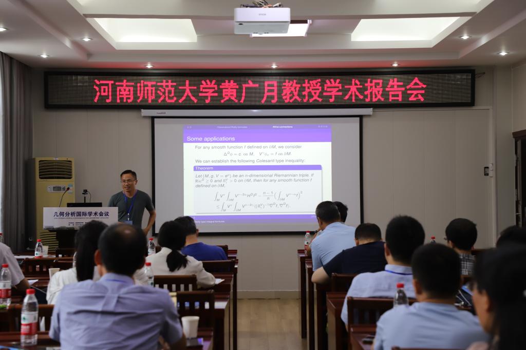 2场报告由河南师范大学黄广月教授报告,题目为《Reilly type integral formulas and some related applications》。在报告中,黄广月教授综述了Reilly 型积分公式的最近研究结果,重点讨论了光滑度量测度空间和具有仿射联络的黎曼流形上的Reilly 型积分公式。最后给出在几何不等式和特征值上的应用。