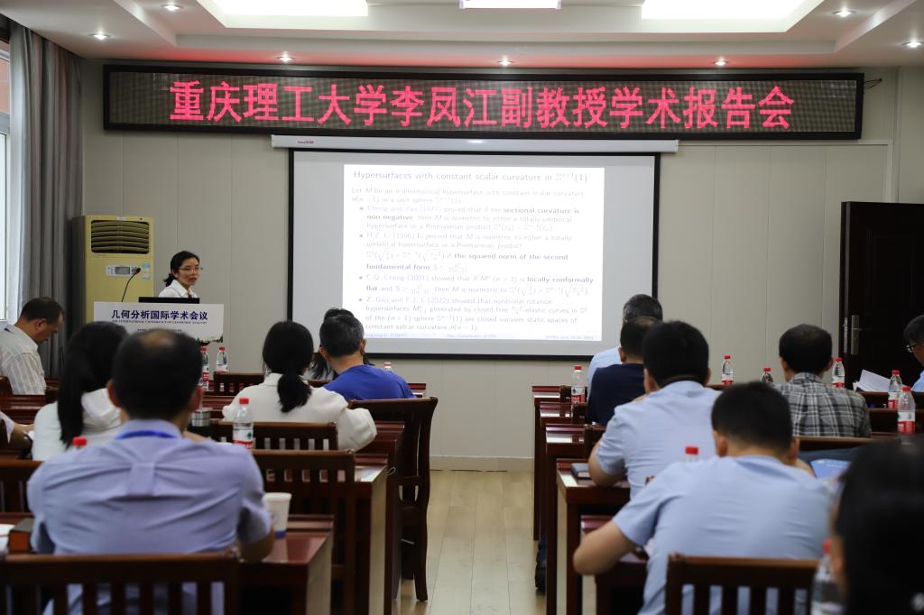 4场报告由重庆理工大学李凤江副教授报告,题目为《New characteristic of vacuum static spaces on rotational hypersurfaces》。在报告中,李凤江副教授给出常曲率空间的旋转超曲面上的真空静态空间的一些新的刻画。