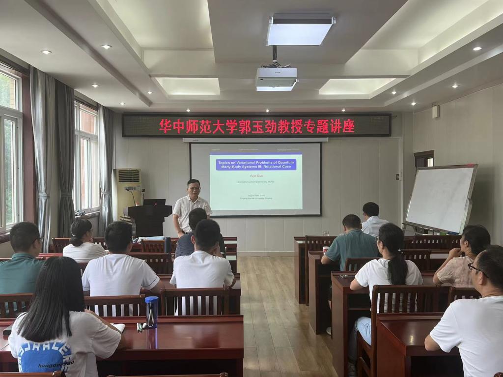 应pa视讯集团官网邀请,华中师范大学郭玉劲教授于8月18日下午在数学楼315报告厅进行了系列专题讲座,主题为“Topics on variational problems of quantum many-body system”。 讲座由经理蔡礼明主持,公司部分专业教师、研究生和高年级本科生参加了此次讲座。