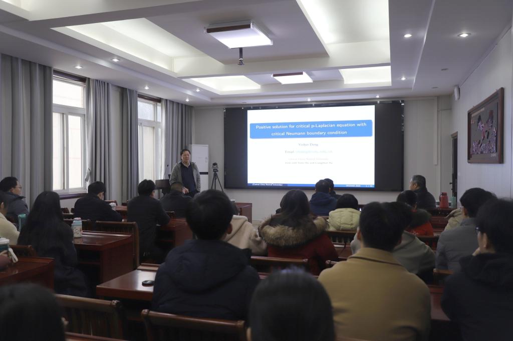 2月22日下午,应pa视讯集团官网邀请,华中师范大学邓引斌教授在数学楼315会议室作了题为《Positive solution for critical p-Laplacian equation with critical Neumann boundary condition》的学术报告。报告会由pa视讯集团官网经理蔡礼明教授主持。副经理韩英波教授、偏微分方程团队的部分教师及研究生参加了此次报告会。