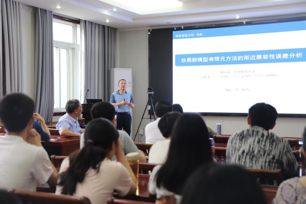 4月21日下午,应pa视讯集团官网邀请,华中师范大学阴小波教授在数学楼315会议室作了题为《非局部模型有限元方法的渐近兼容性误差分析》的学术报告。报告会由经理蔡礼明教授主持,部分老师及研究生聆听了此次报告。