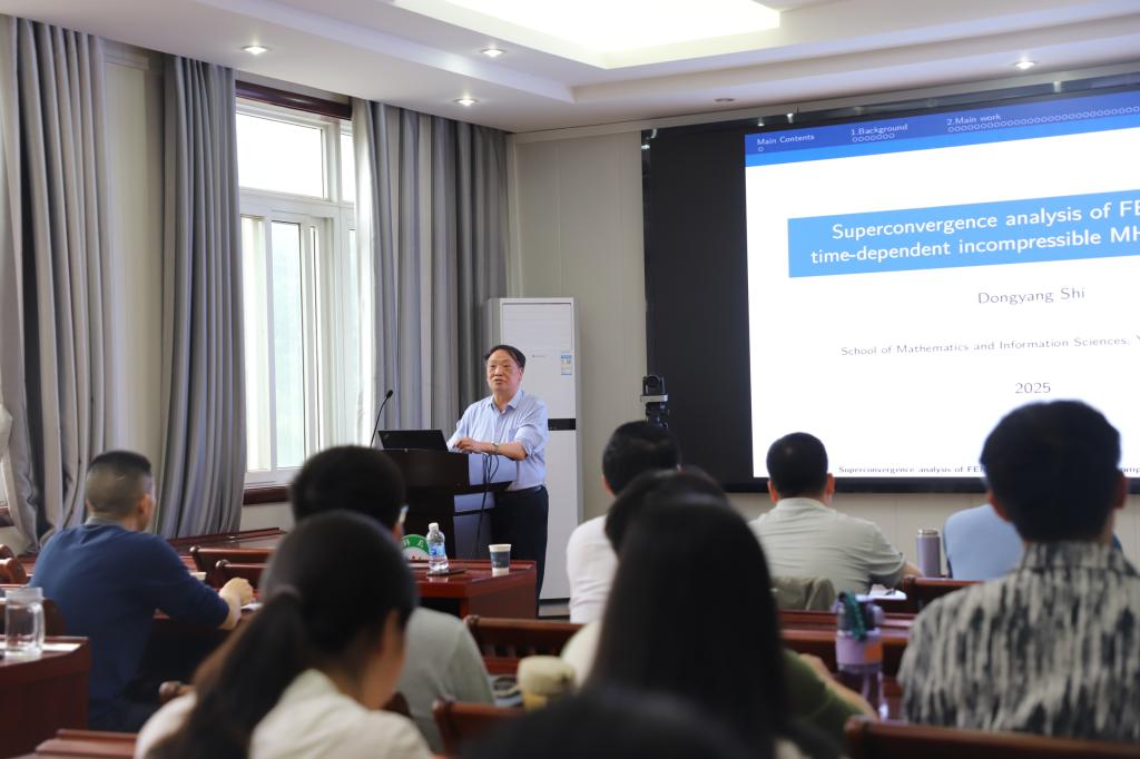 报告中,石教授首先介绍了超收敛方法的基本思想和求解耦合磁流体方程的一些基本方法。随后,重点讲解了非定常不可压缩磁流体方程的低阶混合有限元方法逼近,在时间方向上采用向后欧拉格式,在空间方向分别采用协调元和非协调元加以离散,给出了相应的半隐式全离散格式和数值解在无穷范数下的有界性,在空间和时间网格不受限和避免使用逆不等式的情况下,利用插值后处理技术获得了新的超收敛结果。
