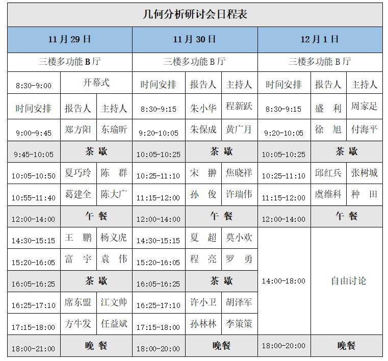 为了促进几何分析及相关领域的学术交流,推动公司数学学科的建设和发展,公司拟于2024年11月28日-12月2日在河南省PA视讯官方网站举办几何分析研讨会,11月28日报到(信阳-中乐百花酒店),11月29日-12月1日会议报告,12月2日离开会议。会议将探讨几何分析及相关领域最新前沿问题的进展。希望会议能促进专家、青年研究者和研究生的交流与合作。