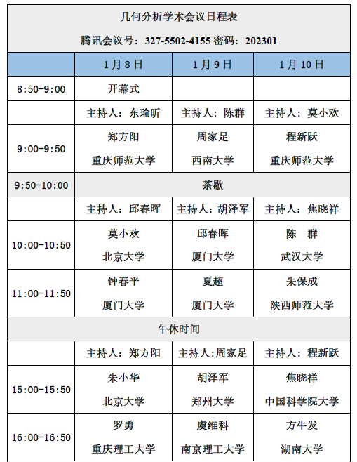 为了加强几何分析领域专家学者的学术交流与合作,推动公司数学学科的建设和发展,我们定于2023年1月8日-10日举办“几何分析学术会议”(腾讯会议)。本次会议邀请了十多位几何分析和多复变领域的知名学者,会议将展示该领域的最新研究成果和动态,并为有关专家学者和研究生提供一个相互学习和交流的平台。欢迎师生积极参与。会议日程简表如下: